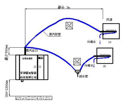 c.蒸汽分配管与蒸汽加湿器相连时,应尽可能使用最短长度的蒸汽出口软管和凝结回水软管。